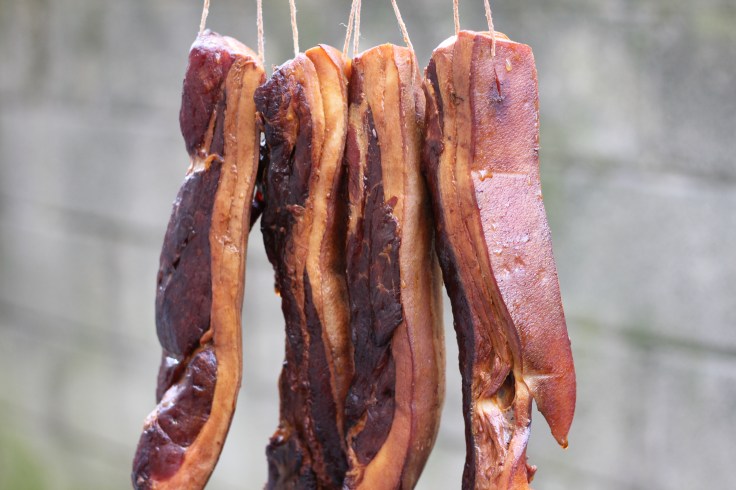 There is no standard formula for making bacon. Firstly, pasture-raised pork is required, with at least 20% fat. The two basic and indispensable spices are usually salt and Chinese liquor (baijiu, 白酒), for a very simple version of bacon. A lot of people in Hubei, Jiangxi, and Anhui make their bacon in this way. If you want it more flavorful, feel free to add more sauces, like soy sauce, star anise, peppercorns, sugar, Chinese Cinnamon, fennel seeds, bay leaves according to your preference. After pork is marinated with spices for about ten days, hung it in ventilation areas and let them almost dry naturally for another one week. If pork’s slab size is bigger or thicker, it will take longer time. How do you tell the bacon is ready? The answer is when you see fat oil starts to ooze out, the tantalizing luster radiates from the bacon. Cantonese people prefer sweeter bacon, adding more sugar. Zhejiang and Shanghai people might like adding more soy sauce. Sichuan and Hunan people might have one more final step—smoking bacon over perfumed wood (such as pine wood, cypress woods) fire.