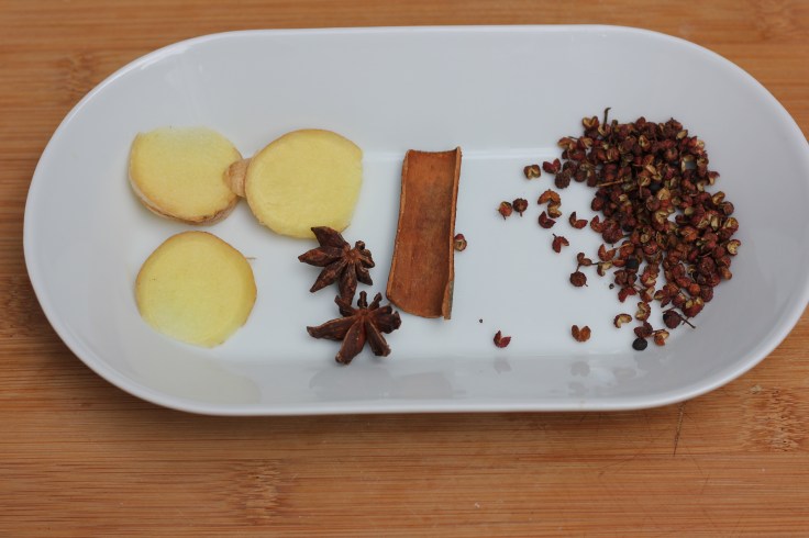 - Add two kinds of soy sauce, star anise, Sichuan peppercorns and Chinese cinnamon to stir fry for three minutes.