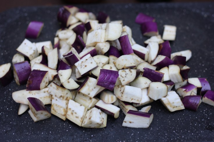 - Three Chinese eggplants, about one pound, chopped into one-inch cubes